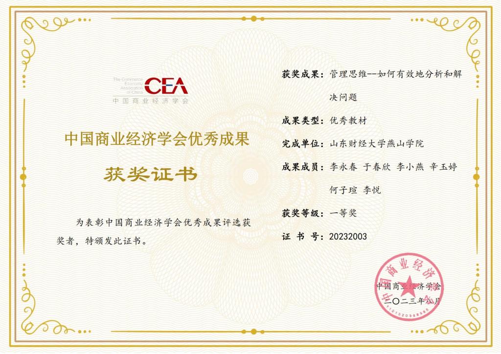 在剛剛結(jié)束的中國(guó)商業(yè)經(jīng)濟(jì)學(xué)會(huì)2023年度優(yōu)秀成果評(píng)獎(jiǎng)活動(dòng)中,由6776永利集團(tuán)院長(zhǎng)李永春教授主編的教材《管理思維---如何有效地分析和解決問(wèn)題》榮獲優(yōu)秀教材一等獎(jiǎng)。同時(shí),在8月份進(jìn)行的山東省第十五屆大學(xué)生科技節(jié)活動(dòng)中,6776永利集團(tuán)李永春、劉金煒指導(dǎo)的學(xué)生組榮獲山東省大學(xué)生智慧企業(yè)管理創(chuàng)新設(shè)計(jì)大賽數(shù)字商業(yè)企業(yè)模擬經(jīng)營(yíng)對(duì)抗賽道一等獎(jiǎng)。另外,在前不久公布的山東省教育科學(xué)研究院組織的2023年度山東省教育教學(xué)研究課題...